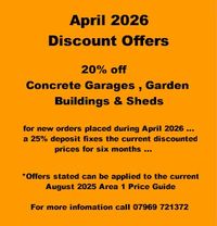 Concrete Garages currently starting from : £2,995-00- *... this is for a 16`3" long x 8`6" wide Standard Pent Spar garage with a 7`ft wide horizontal up & over door (white) , softwood treated timber fascias , box-profile galvanised steel roof sheets (with an anti-drip felt layer on the underside of the sheet) , one 4`ft wide softwood treated timber window ... the price includes delivery & installation in the TS, DL, DH & SR postcode areas ... the full concrete garages & buildings range can be seen in the August 2025 Area 1 Price Guide ... *price stated has had the current discount applied to it ... this is for orders placed during April 2026
